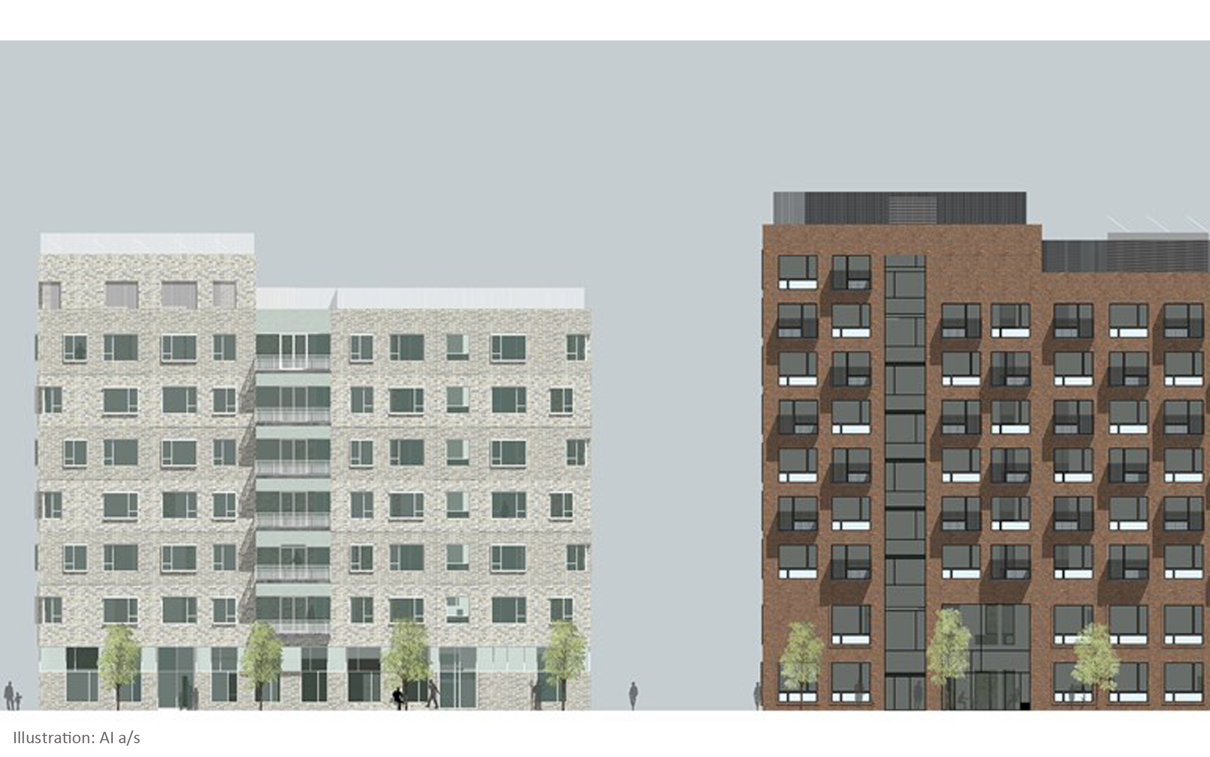 To ”tårne” med teglstensfacader med 50 plejeboliger til sindslidende i ni etager og 60 specialplejeboliger til multihandicappede i otte etager er opført nær Royal Arena på Amager.