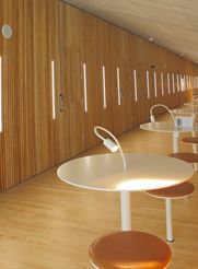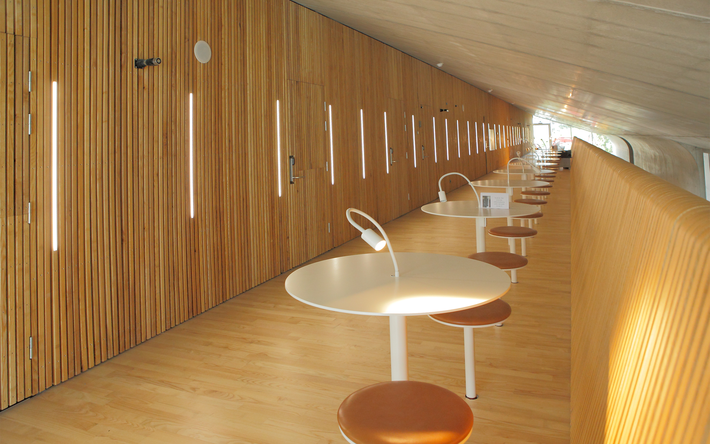 Undervisningsbygningen i 2 etager blev udført i in situ-støbt beton med runde overgange mellem gulv/væg og væg/loft. På de få elementvægge blev der monteret trælameller med skjult lys. Facaden blev udført i glas/alu.