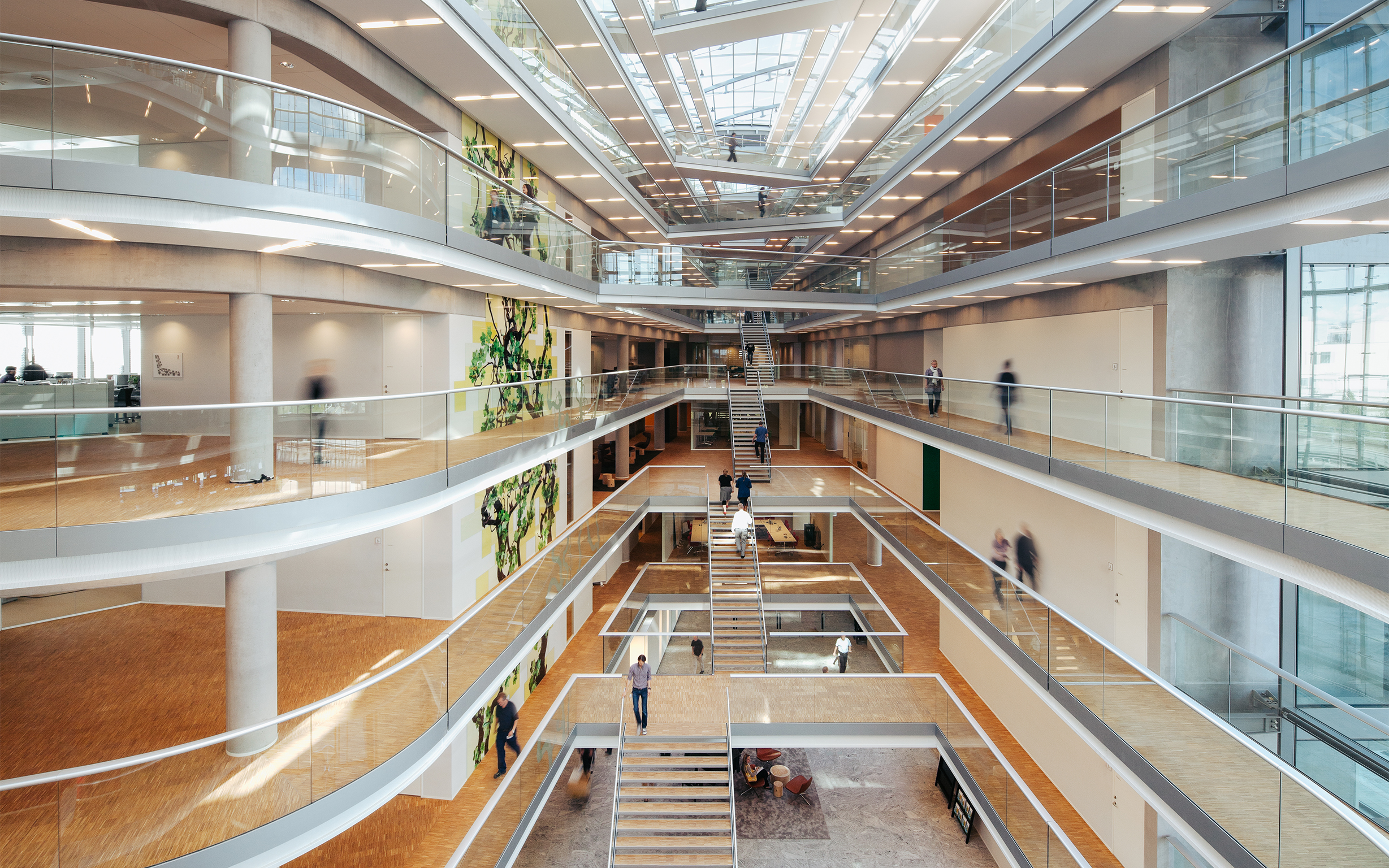 Over husets centrale atrium er der et 1.200 m² stort ovenlys med et spænd på 11 m. Søjle- og bjælkekonstruktionen er med stabiliserende kerner i efterspændte betonelementer.