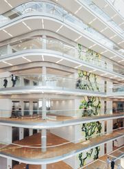 Hovedkontoret er indrettet med et centralt atrium, 1.200 m2 ovenlys og glas-alu facader